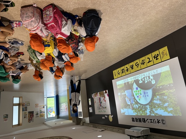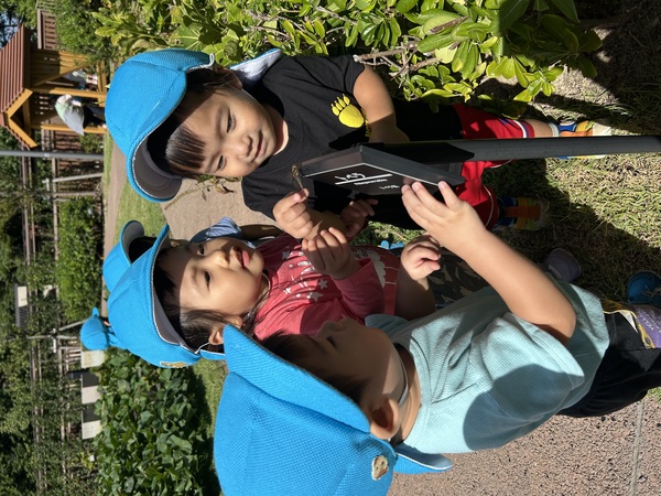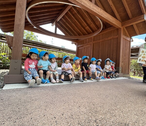 図書館行ってきたよ! (うさぎぐみ) 暑い夏を経て、体力もつき頑張って歩く距離も伸びてきた子どもたち。 お天気も良かったので、みんなで県立図書館へ行ってきました! 図書館の中庭になっているりんごを「おいしそう!」と言って近くで見たり、止まっているトンボを見つけ恐る恐る撫ででみたりと、秋の虫や自然物に触れて楽しみましたよ! 2025/10/09