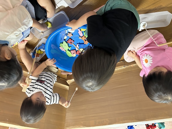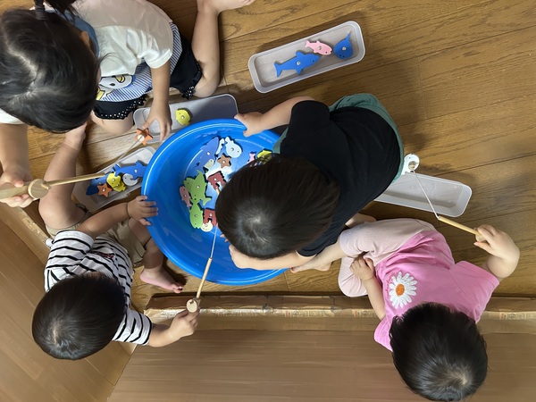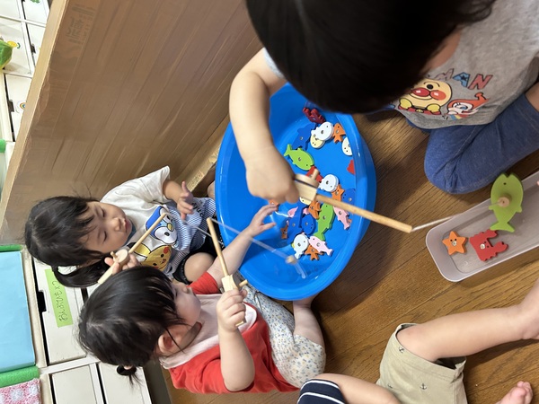 ドキドキ魚釣り (うさぎぐみ) お部屋で魚釣りをして遊びました! 一度保育士が釣ってみると、磁石と磁石がピタッとくっつき釣竿についてくるお魚に大興奮の子どもたち。 釣竿がユラユラと揺れて難しいかな?と思いきや、欲しい魚にじっと狙いを定め、どんどんと釣って楽しんでいましたよ! 特に大きなサメやピンクの可愛い魚が人気で、「さめ!」「見て!」「釣れた!」と嬉しそうにお話してくれました! 2025/09/26