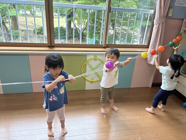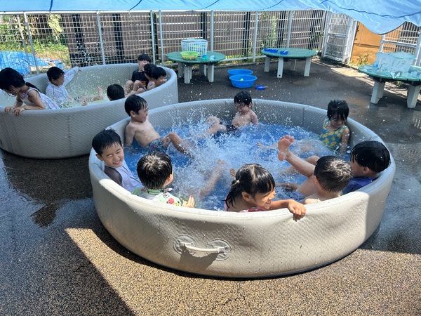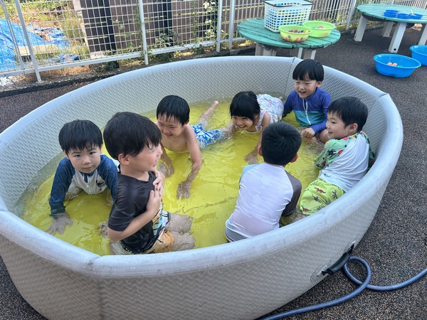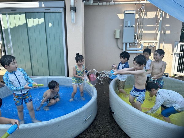 水遊び (ふじぐみ) 待ちに待った水遊びが始まりました!毎日、今日プールが準備してあるかテラスをチェックする子どもたち! 水鉄砲や水風船、色水遊びなど忙しそうに遊んでいます。日々、ダイナミックになってくる水遊び!初めは顔にかかった…と泣き顔も見られましたが今では顔に水がかかってもへっちゃらになってきました! 2025/10/03