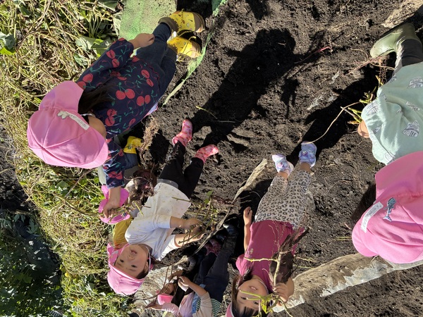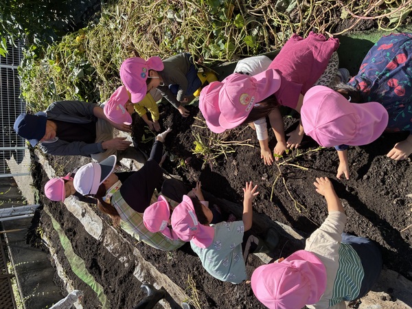 さつまいも掘り (ももぐみ) 上野農園でさつまいもを掘りました!登園した時から、「さつまいも掘る!」と意気込んでいた子もいました。土を掘り、さつまいもが少し見えてくると、「あったー!」とすぐに引っ張り出そうとするもも組さん。周りの土を掘ってからだよと伝えましたが、「うんとこしょ!」と言いながら引っ張らずにはいられない様子でした。掘れたさつまいもを手に持つと「おもい」という感想が聞かれましたよ。 2025/10/09