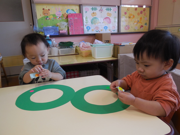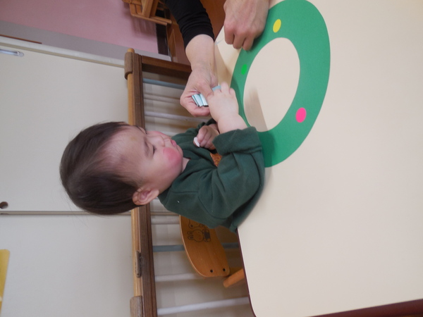 クリスマスリースを作ったよ! (ひよこぐみ) クリスマス制作でリースづくりをしました。 シールを貼るよりもはがすことに興味を持っていた子どもたち! 今回は貼ることにチャレンジしてみました!初めは、シールが指にくっついたり、粘着面が裏側になったりで、なかなか思うように貼れず。そっと手を添えてペタン!と貼れると、手をパチパチして嬉しそうでした! 2025/12/18
