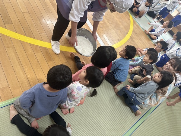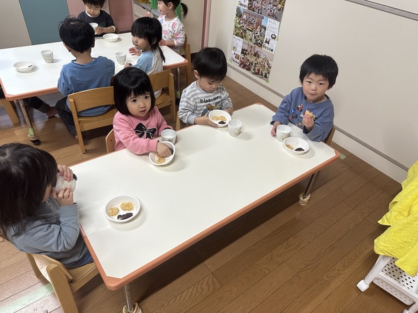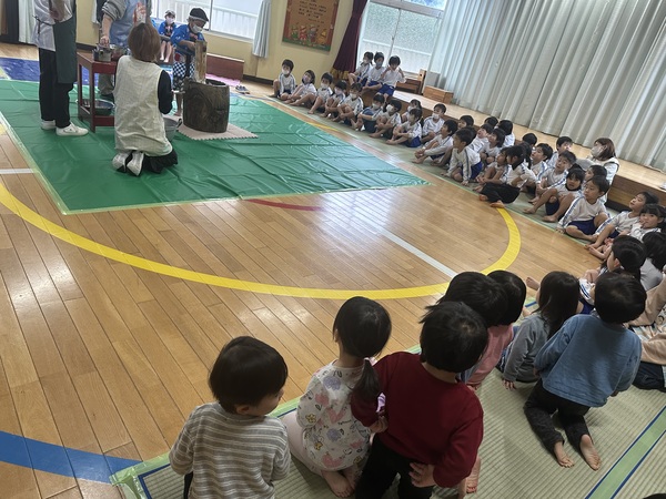 おもちつき会 (ももぐみ) おもちつき会に参加しました!まつ組のお友達や先生がお餅をつくのを「よいしょー!」とかけ声をしながら応援しました!柔らかくなっていくお餅に興味津々の子どもたちです!つきたてのお餅を「おいしい」と嬉しそうにほおばっていましたよ! 2025/12/18