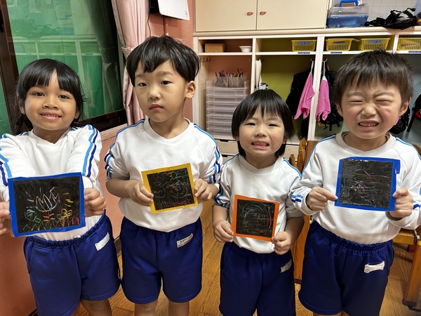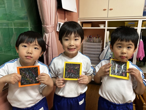 引っ搔き絵制作 (ふじぐみ) KIOが大好きなふじぐみさん! 今日はいつもの自由制作と異なり、「引っ搔き絵」をみんなで作ることに! 興味津々で説明を聞き、作り始めました。 画用紙を好きなクレヨンで色を塗ってから、その上を黒色で塗りつぶします。 「本当に黒く塗っていいの?」とちょっぴりわくわく(笑) 割り箸で引っ掻いて、色が出てくると「虹色やぁぁぁ!」と大興奮。 黒でまた塗ると何度でも繰り返し楽しめるので、夢中で描いていました。 2026/01/15