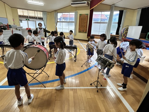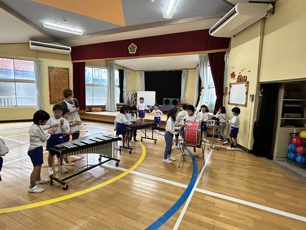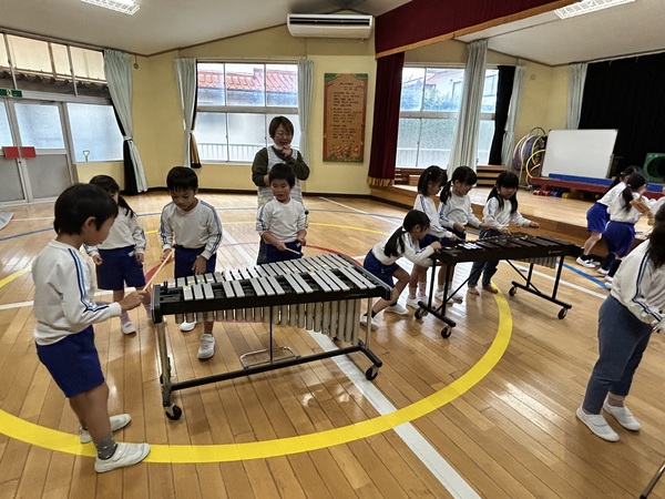 楽器あそび (まつぐみ) 園にある木琴、鉄琴、太鼓などに触れて音を出したりと楽しみました! 「これもドレミある!」「鍵盤ハーモニカと一緒やね」など気付いたことを言葉にしていた子どもたち。「あわてんぼうのサンタクロース」の楽譜を用意し、好きな楽器を自分で選択!みんなで合奏も楽しみましたよ! 2026/01/15