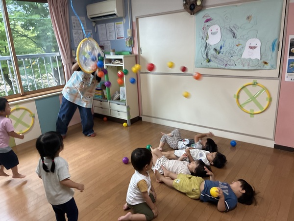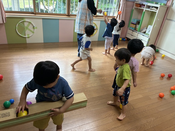 ボール遊び (ももぐみ) 室内でボール遊びをしました。カラーボールに子どもたちのマークシールを貼ると、子どもたちは自分たちのマークが付いたボールを探し、箱の筒に入れて転がる様子を楽しんでいました。お友だちのマークを見つけると、「あったよ」と教えてあげたり、わたしたりする姿もありました。袋の中にボールを投げ入れ、ボールがいっぱいになったところで中のボールを飛ばすと、「きゃーー!」と大喜びでした。「3・2・1!」とみんなで合図をし、ボールが飛んでくる位置に寝転んで、ボールが降ってくるのを楽しんでいる場面もありました! 2025/09/26