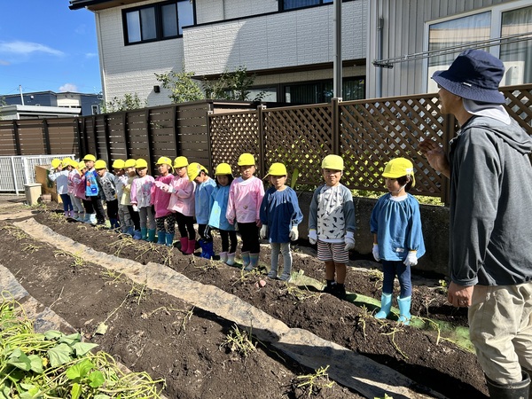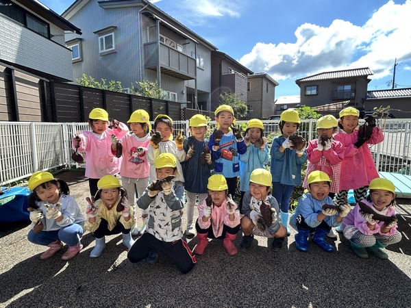 さつまいも掘り (まつぐみ) 園の畑で育ったさつまいもを収穫しました! 土に触れ、お芋が見えてくると「みて!芋出てきた」「大きそうじゃない?」などと子どもたちも大はしゃぎ!折れないようにそっとそっと土をどかしながら頑張っていましたよ。 「これ取ったよ」など友だちと見せ合いっこして満足そうなまつさんでした! 2025/10/15
