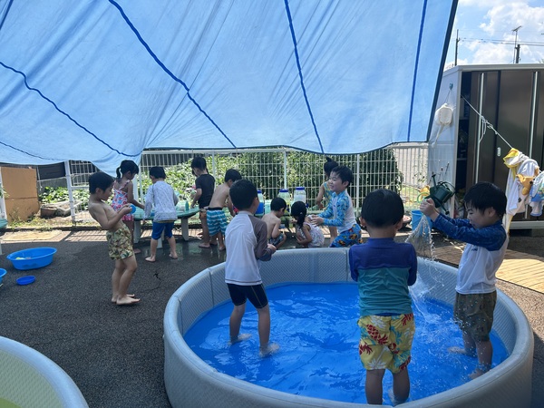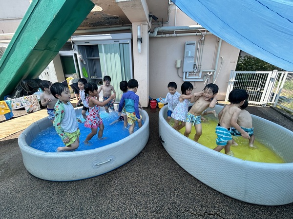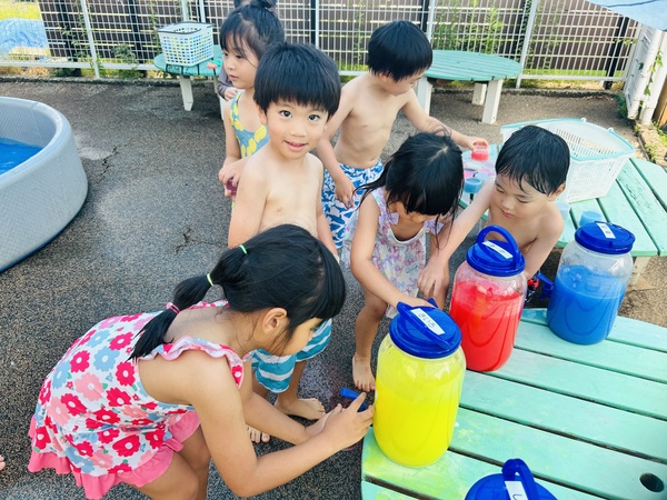 水遊び2 (ふじぐみ) 「そろそろプール入るよ〜」と声をかけるといつも以上に準備が早くなるふじ組さん(笑) 色水遊びも混色を楽しみ、最近ではグラデーションカラーまで作れるようにもなりました! プールの中で追いかけっこを楽しんだり、暑さを吹き飛ばすぐらい元気いっぱいです! 2025/10/15