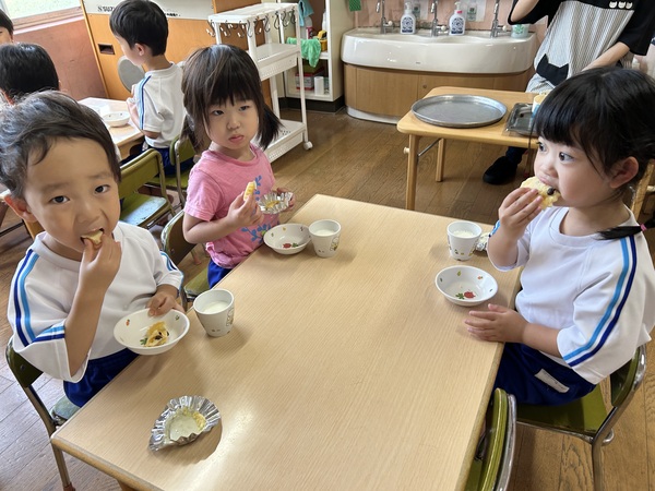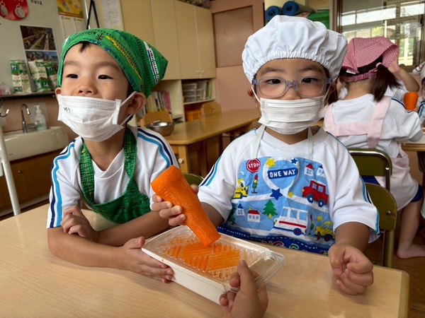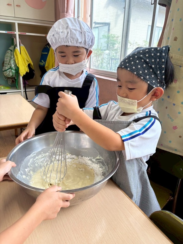 レッツ!クッキング (うめぐみ) うめ組になって5回目のクッキング!エプロンの着脱も1人で出来る子が多くなってきました。10月のクッキングは、人参の米粉蒸しパン!初めて使う調理器具に興味津々の子どもたち!人参をすったり、材料を全て入れてかき混ぜたりと、とても楽しんでいましたよ!おやつの時間に「美味しい〜!」と頬張っていた可愛いうめ組さんです♪ 2025/10/15
