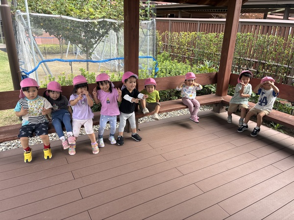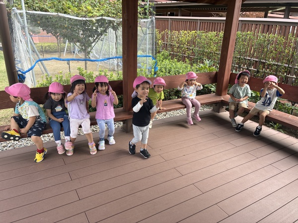 図書館までお散歩! (ももぐみ) 9月の遠足で行けなかった県立図書館まで行ってきました!図書館行こうと伝えると、「やったー!」「ママと行ったことある!」と嬉しそうな子どもたち。図書館に入る前に、大きな声を出さないお約束をすると、お約束通りひそひそ声で話すもも組さん!こどもエリアから中庭の方へ行き、果物がなっている木を観察したり、屋根が付いている所で一休みしたりして楽しむことができました。 2025/10/24