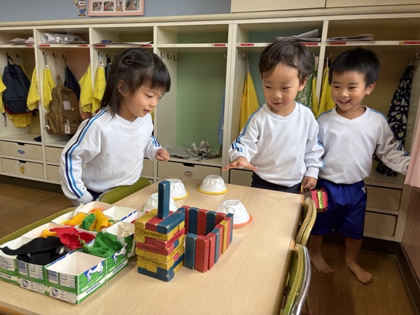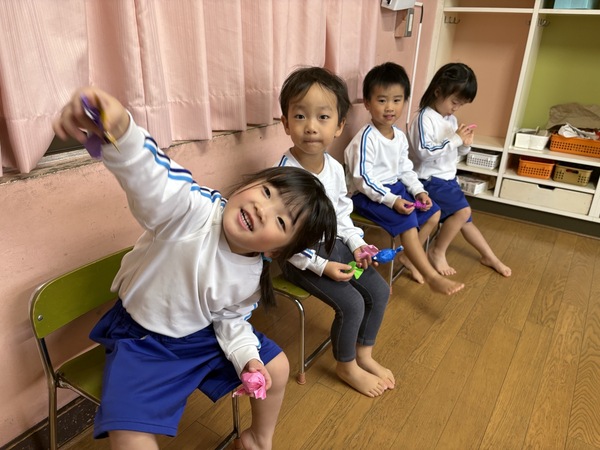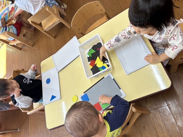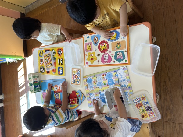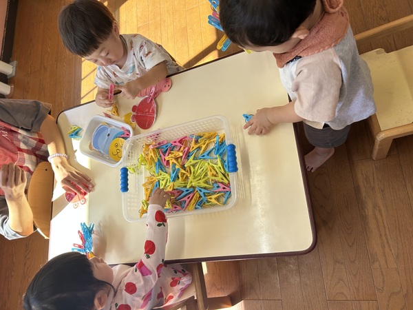 ぼくたちできるよ! (うさぎぐみ) 外や遊戯室で体を動かすことが大好きな子どもたち。 運動遊びだけではなく、パズルなどお部屋でじっくり行う遊びもとっても上手です! 洗濯ばさみも最初は難しくて保育士と一緒に練習していましたが、今では子どもたちの力でたくさん挟み、「かびるんるん!」「バイキンマン!」「かに!」と嬉しそうに見せてくれることが増えました。 また、パズルも簡単なものから少しピースの数を増やして難易度が上がったりと、指先を使ったり少し考えて遊ぶような玩具も楽しんで過ごしていますよ! 2025/10/24