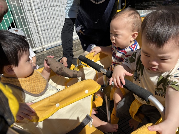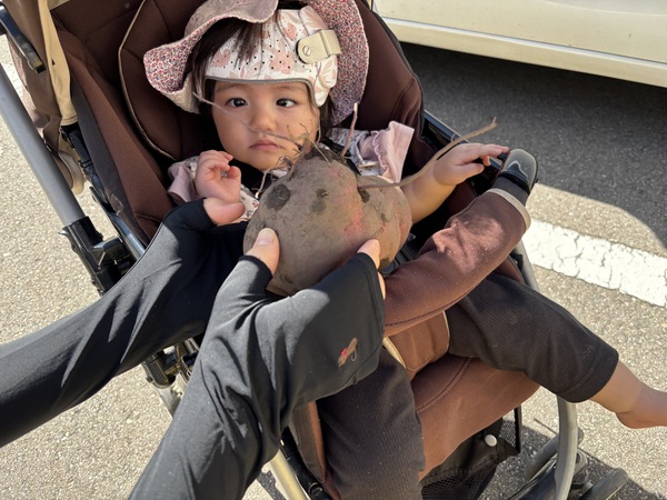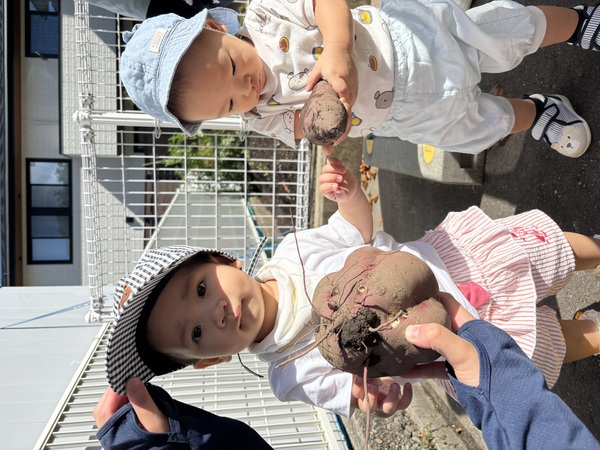 さつま芋おっきいな! (ひよこぐみ) 上野子ども農園でサツマイモがたくさん収穫できました。 おにいさん、おねさんが芋ほりしている様子をじーっと見ていた子どもたち! 大きなさつまいもを近くで見せてもらうと、これはなに?≠ニ顔をしかめる子、おそるおそる触れたり、手で持ったりする子、みんな初めての体験でした! 2025/10/24