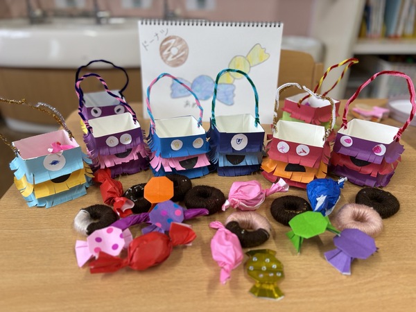 ハッピーハロウィン! (うめぐみ) 今年度はハロウィン制作をいくつも楽しんだため、子どもたちもこの日を楽しみにしていました!ハロウィン当日は、ハロウィンバスケットやお菓子探しなどをして楽しみましたよ♪2週間うめぐみに入ってくれていた実習生からも、毛糸で作ったドーナツや折り紙で折ったキャンディーなどをもらい、とても嬉しそうな子どもたちでした! 2025/10/31