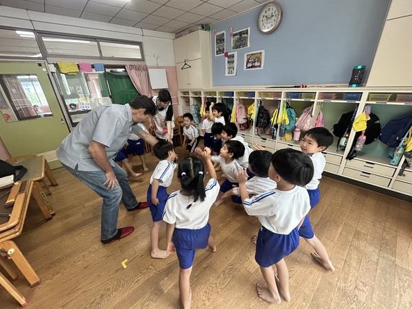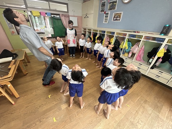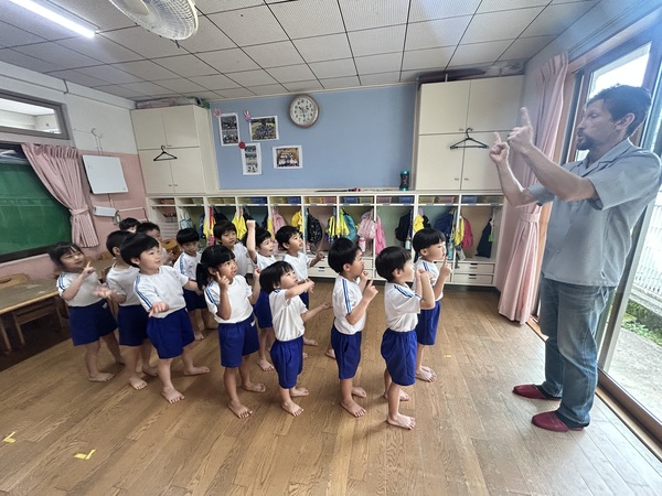 遊び歌 (ふじぐみ) 英語教室で色々な遊び歌を教えてもらいます! 最近習った、「Hokey Pokey」や「The Wheels on the Bus」が特にお気に入り!講師の先生を真似ながら歌ったり踊ったり!楽しそうです。 曲をかける時は「ティーチャー、ミュージック プリーズ!」と英語も少しずつ覚え、上手に言ってくれます(笑) 2025/09/19