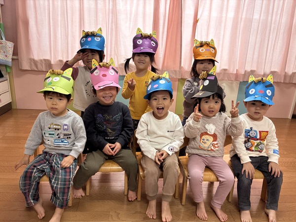 節分 (うめぐみ) 節分制作ではサンバイザー型のお面を作りました!好きな色の絵の具を選んで塗っていったり、目や角をハサミで切ったり、のりでパーツを張り付けたりと、たくさんの作業を真剣に取り組んでいました。 節分当日は節分の由来を聞いたり、‟鬼のパンツどこいった?“のペープサートを見たりしましたよ!他にも節分玉入れをし「先生!3個も入った!!」と盛り上がっていました! 2026/02/13