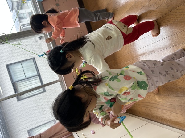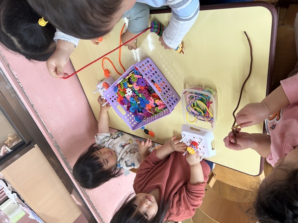 ロンビーに挑戦! (ももぐみ) 幼児クラスのロンビーという玩具を借りてきました。初めて遊ぶ玩具に興味津々で、真剣表情で遊んでいました!お友達の作品と合体して超大作を作りあげたり、ひたすら繋げて円にしたりと、子どもたちがそれぞれ何かをイメージしながら作る姿が見られましたよ!出来上がったものをいろいろな形に見立て、「傘」や「ハンドル」など手に持って遊んでいました。「またしたい!」ととても気に入った様子でした! 2026/02/06