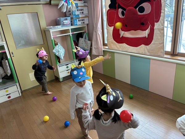 節分 (ももぐみ) 節分集会に参加したあと、ボールを使って豆まきをしました。「おにはそと!ふくはうち!」と鬼の顔に向かって一生懸命ボールを投げました!そのあと、保育士が鬼のお面をかぶると、ほとんど怖がる子はおらず、大笑いしながらボールを当てて楽しんでいました。とっても強いもも組さんです。今年も楽しい1年になりますように! 2026/02/19