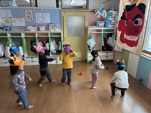 ドキドキ節分!! (うさぎぐみ) ドキドキワクワクの節分がやってきました! 子どもたちは、鬼のパンツの体操が大好きで、自由遊びの際も歌って踊って節分を楽しみにしていた様子。 節分当日は、お部屋にやってきた大きな鬼の顔に驚きつつも、勇敢にカラーボールを投げて豆まきしてくれましたよ!! 2026/02/06